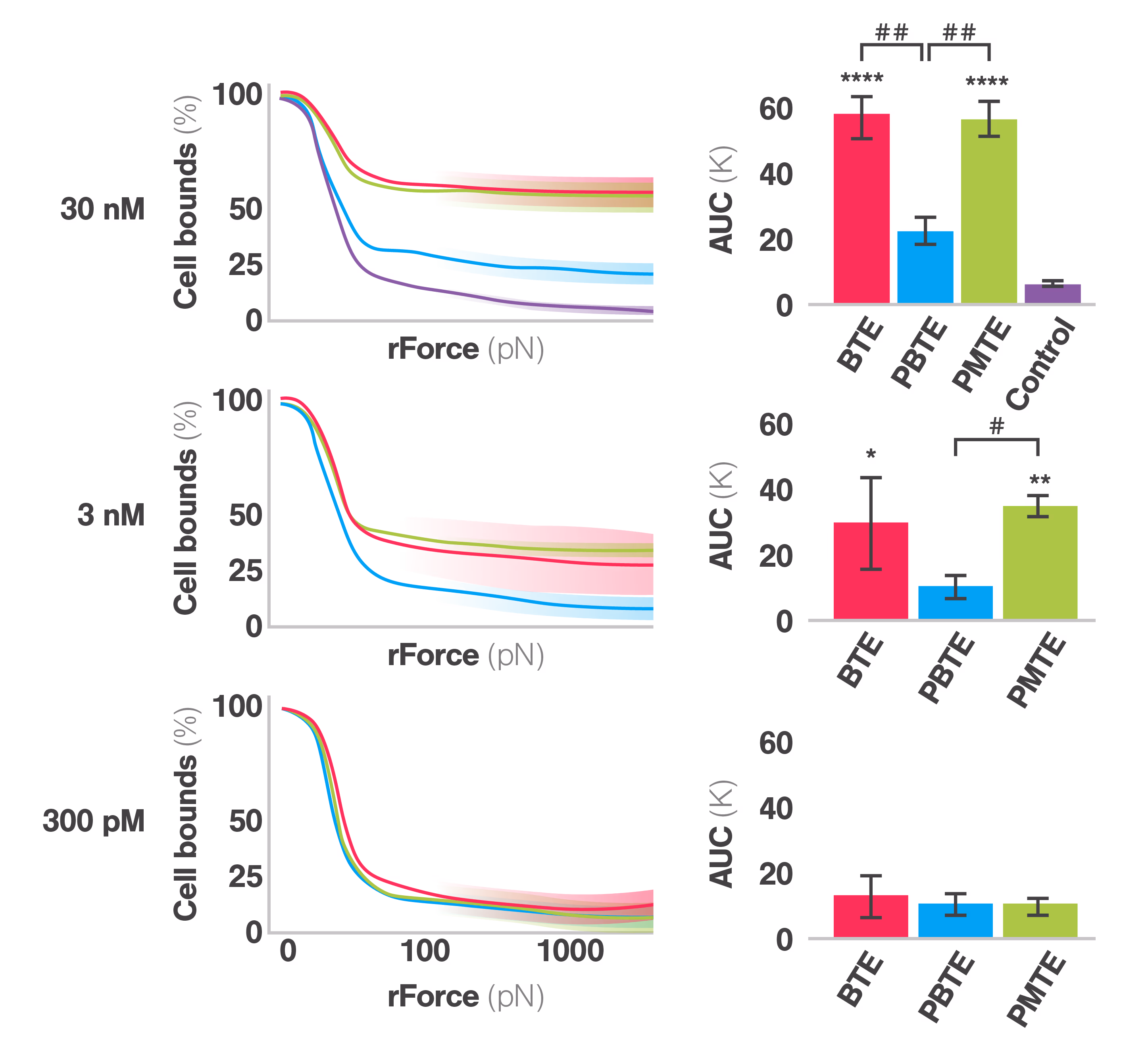 Cell avidity curves represent the % of target cells bound with rising detachment force measured at 30 nM, 3 nM and 300 pM antibody concentration. Area-under-curve quantifications indicate the significant differences in cell avidity between PBTE and PMTE at relevant concentrations. Adapted from: O’Connell et al. (CC-BY-NC)