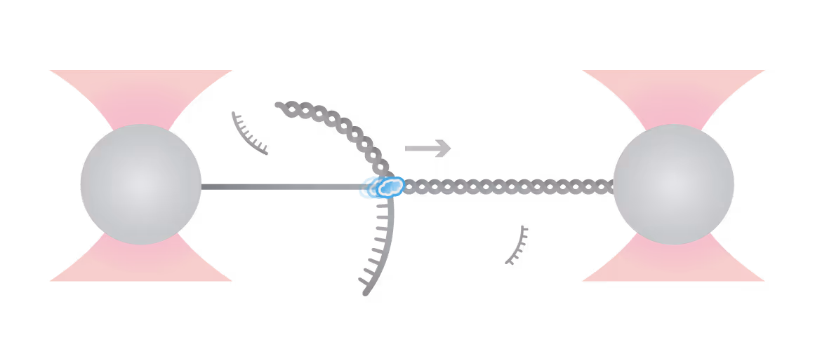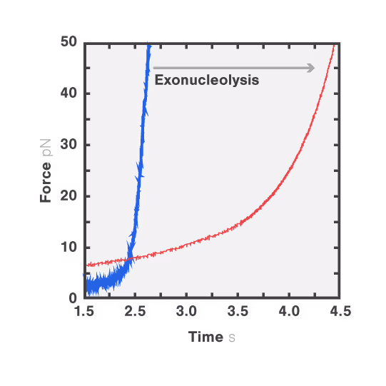 In this experiment, the exonuclease activity of the T7 polymerase was investigated. This is a DNA polymerase from the T7 bacteriophage that copies DNA strands in the 5’→ 3′ direction, and also features exonuclease activity. For this analysis, an optically trapped double-stranded DNA was held at a constant force that induced exonucleolytic activity of the polymerase. By removing nucleotide after nucleotide from one strand, the polymerase was unwinding the dsDNA. As the length of single-stranded DNA is longer compared to its double-stranded state, the unwinding resulted in a gradual increase in the end-to-end distance of the DNA (Figure a). This change in length was directly translated into the activity of the T7 DNA polymerase and the number of nucleotides it processed over time (Figure b). Specifically, short activity bursts ranging between 3 and 10 nucleotides were revealed, interspersed by frequent pauses of varying duration. This provided deeper insights into the dynamics of T7 exonuclease activity.