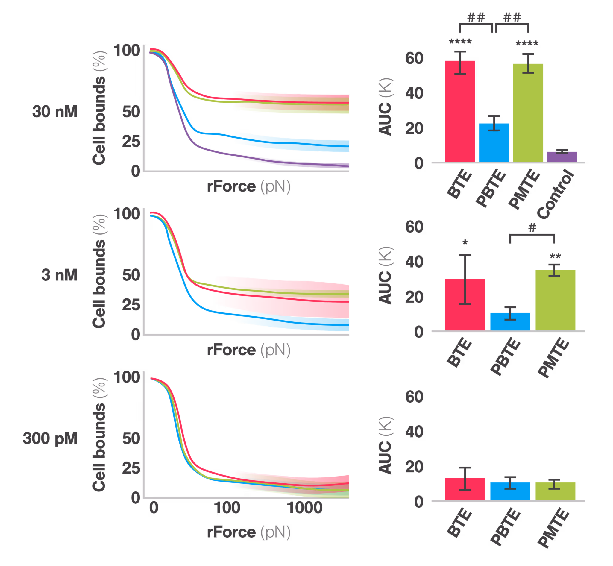 In contrast, the PMTE not only restored but also exceeded the binding strength and avidity observed in the first-generation BTE, demonstrating superior performance in enhancing cell targeting and therapeutic efficacy.