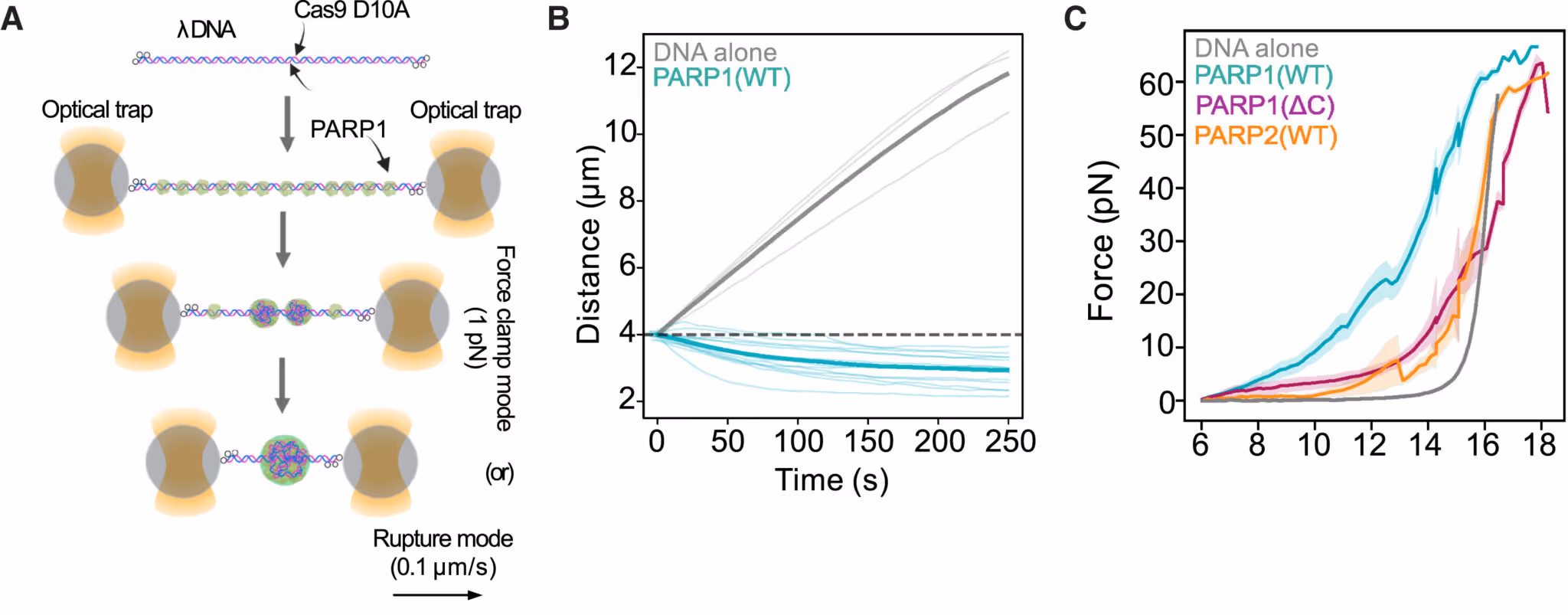 The C-Trap also allows scientists to stretch DNA, and precisely measure the force exerted. The force required to elongate DNA with PARP1 (WT) was much higher than for DNA alone or DNA with PARP1 (∆C) or PARP2 (Figure C) which don’t form condensates. Another direct evidence of PARP1 condensates physically connecting DNA lesions!