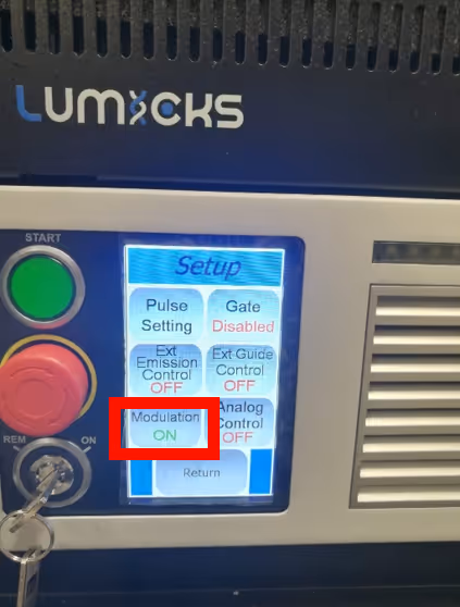 3. The laser screen should now look like the final image shown. Confirm that modulation is off.