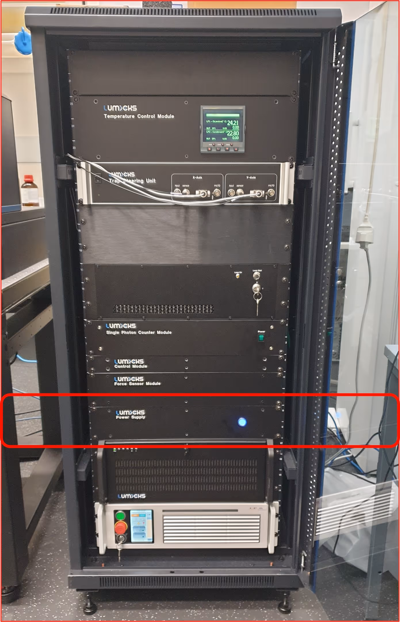 ⚠️ Known issue: A small batch of power supply units may have buttons that stick in the on/off position. If you encounter this issue, contact support@lumicks.com with your C-Trap serial number and a description of the problem.
